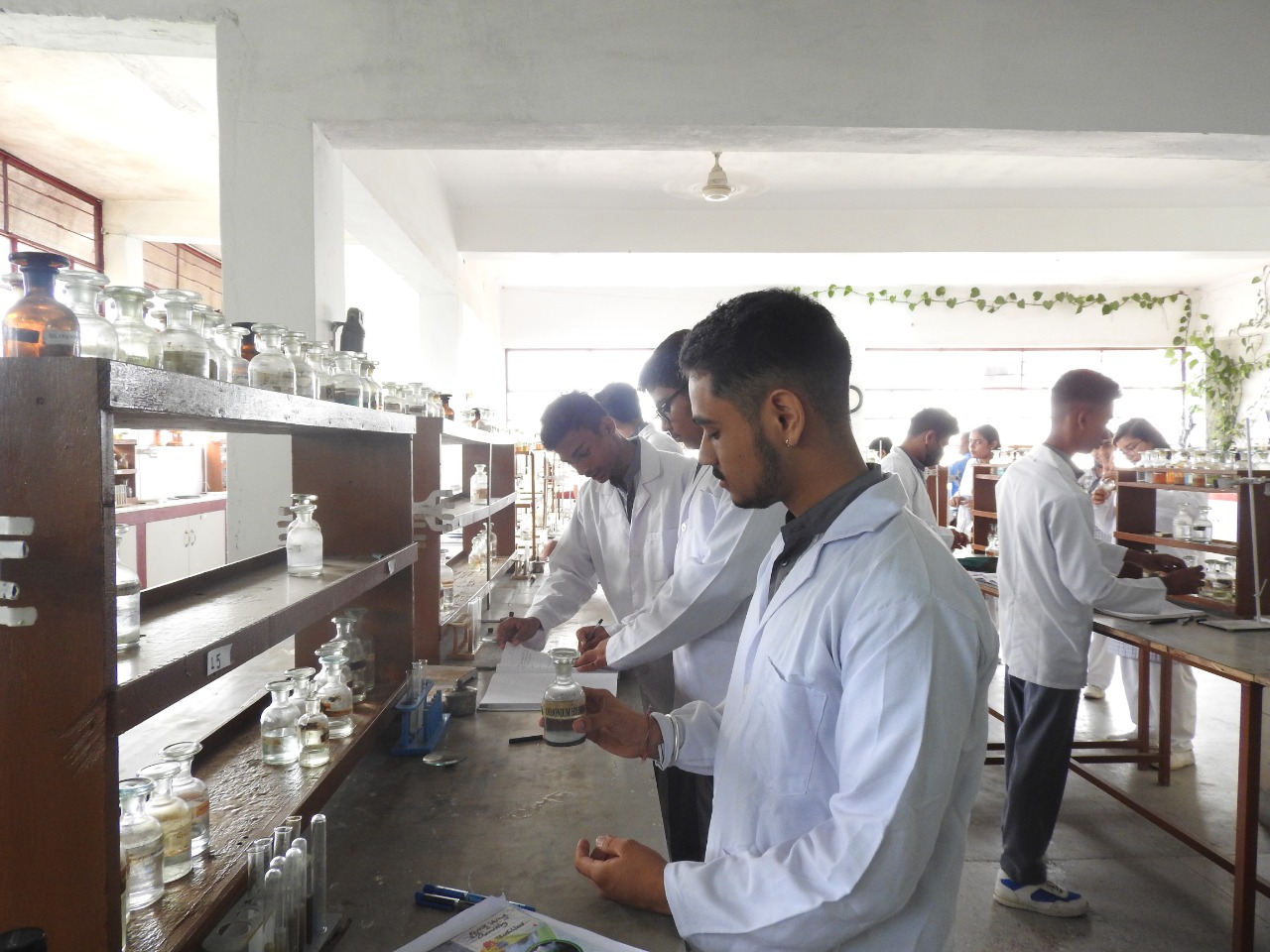 The Lab is provided with the state- of- the art devices like- Fume hood, Distillation unit, Electronic weighing machine, Bunsen burners, beakers and flasks. Concealed gas line and the safety devices such as Firefighting equipment, First- Aid Kit etc. The acids and other reactive chemicals are stored in separate locked cupboards as a further precautionary measure. The students are provided with separate workstations with individual burners and plug points. The apparatus includes the common place strikers, mortar and pestle, clay triangles, watch glasses, crucibles, crucible tongs, chemical spoon, stirring rods, filter funnels and a variety of stoppers.